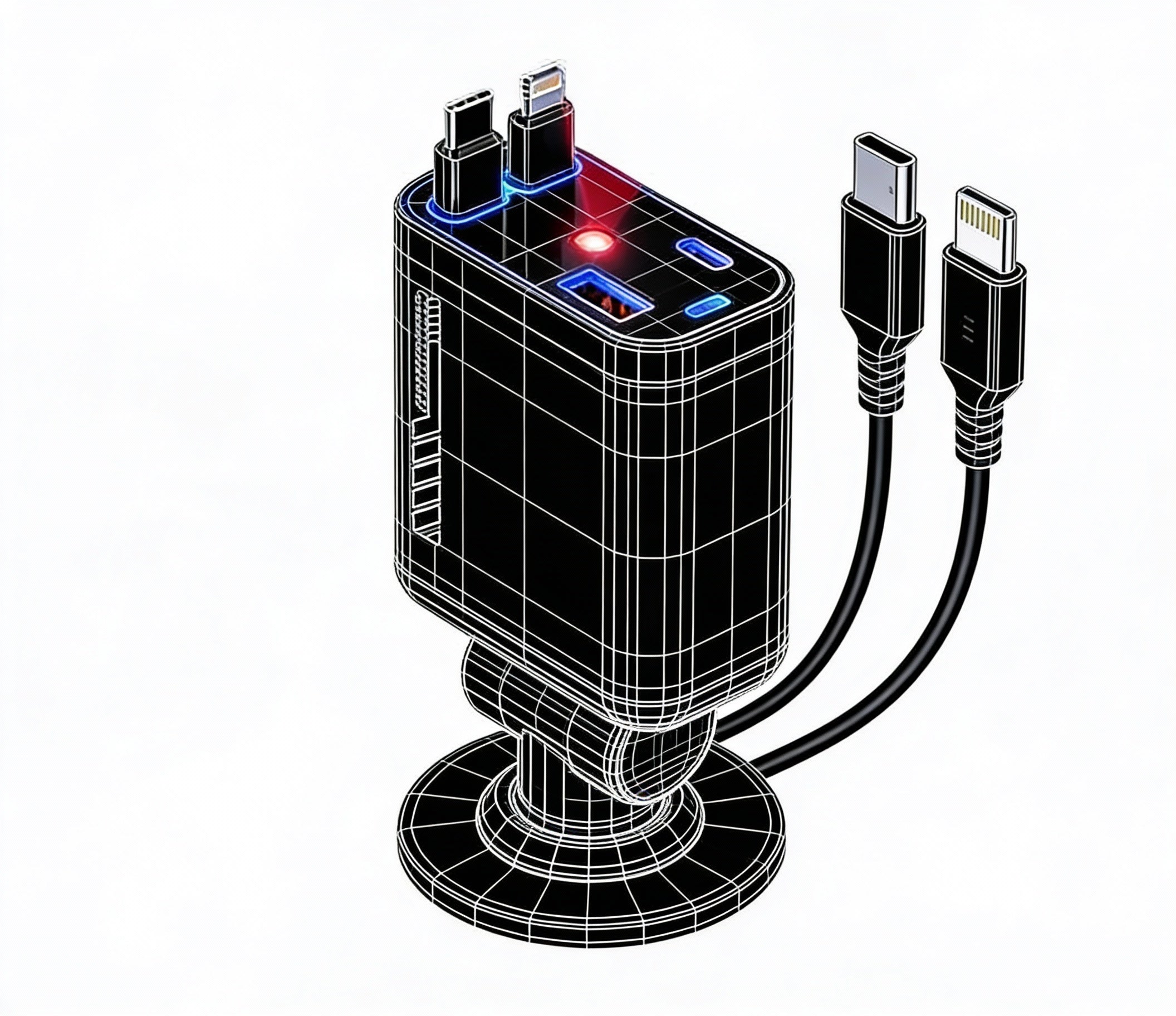 Ports: 2× Retractable Cables (Type-C + Lightning, 80cm extension) + 1× USB-C Port + 1× USB-A Port (4 devices simultaneously)